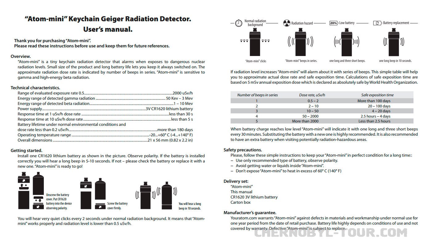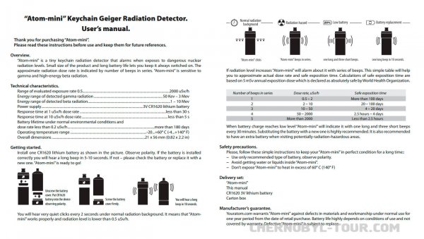Atom-MINI - is a radiation detector that rates and indicates the level of radiation background notifying the owner about the danger of its exceeding. Atom-mini permanently, twenty fours hours rates radiation background without requiring any control or calibration. Finding dangerous radiation levels for the shortest term (no more, than in 20 seconds), it notifies the user on such excess by peep.